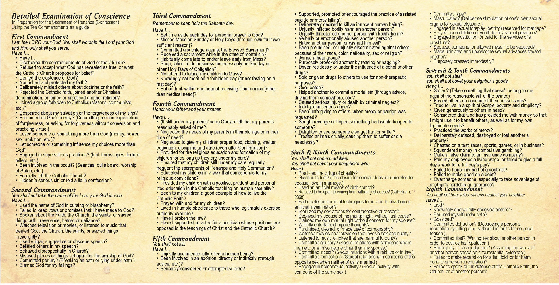 This 4-panel prayer card includes a Detailed Examination of Conscience, ideal for preparation for the Sacrament of Penance (Confession). Content is based on the Ten Commandments and contains great detail.