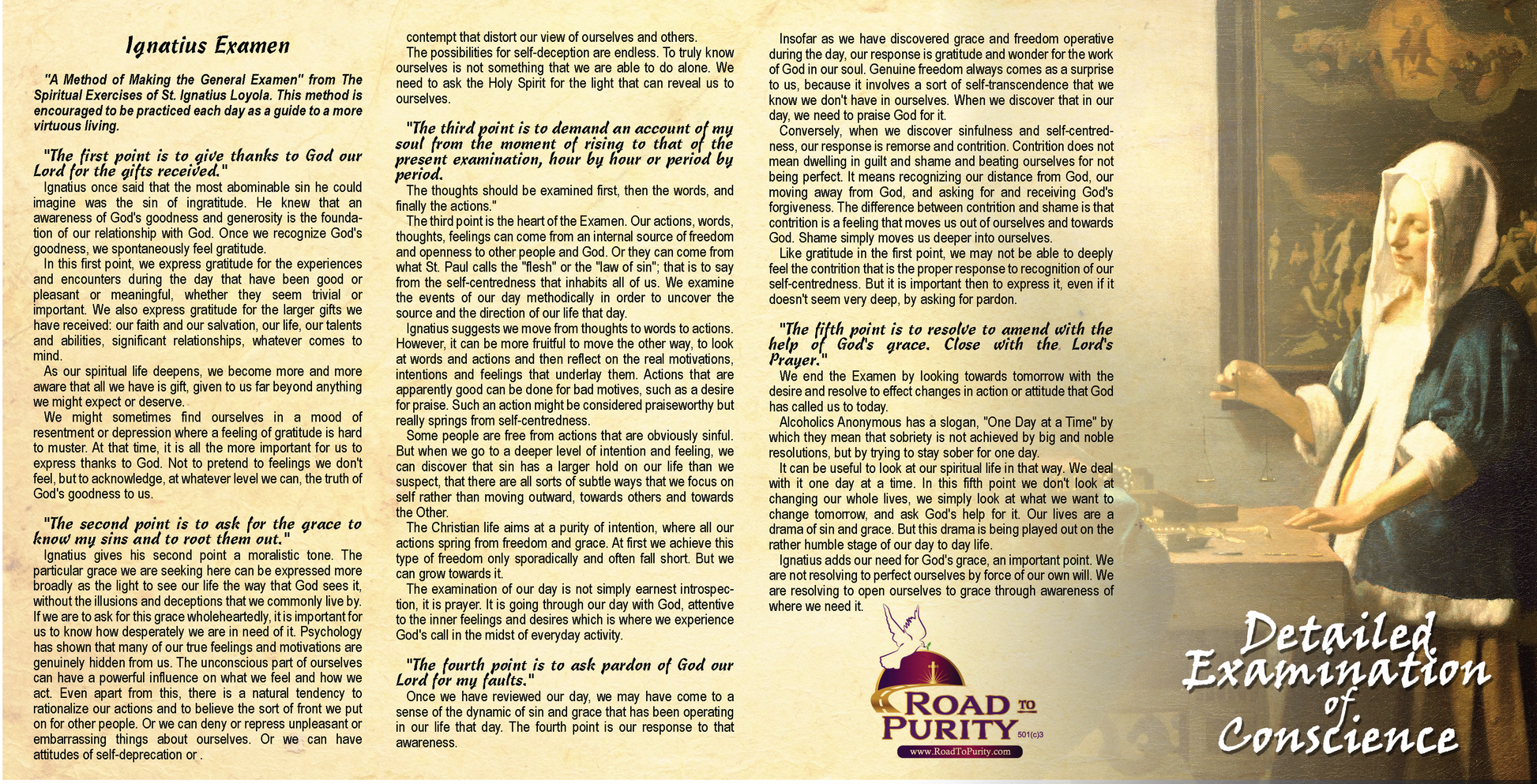 Also included is the Ignatius Examen which is โA Method of Making the General Examen" from The Spiritual Exercises of St. Ignatius Loyola. This method is encouraged to be practiced each day as a guide to a more virtuous living.