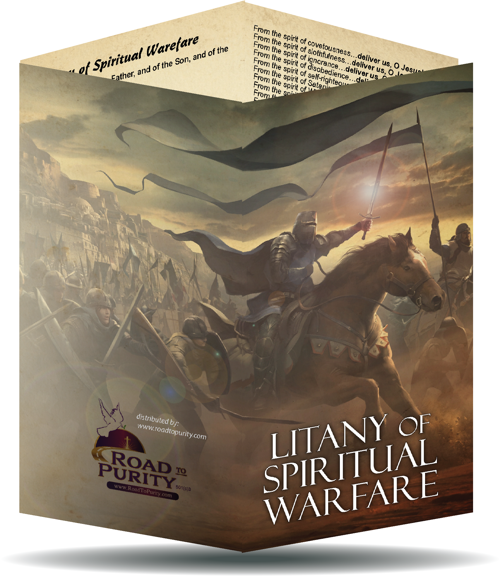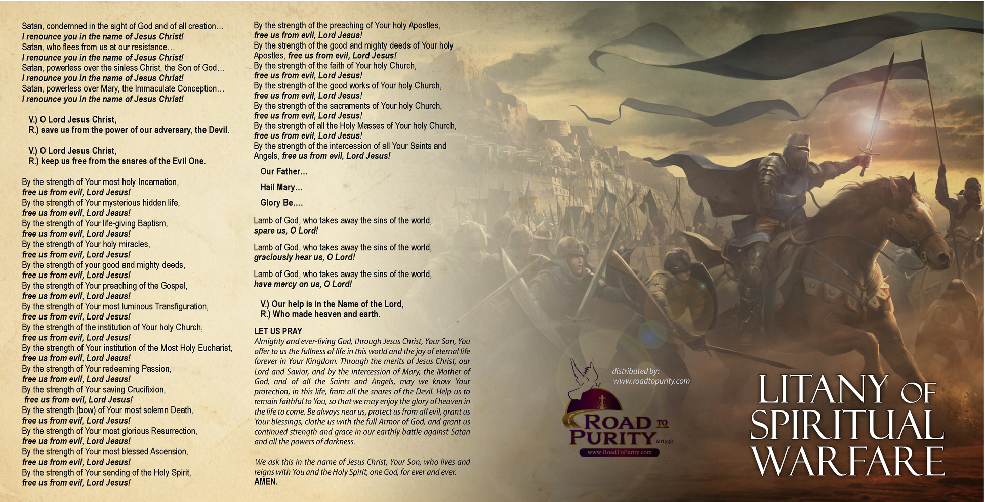 This 4-panel prayer card includes the Litany of Spiritual Warfare.