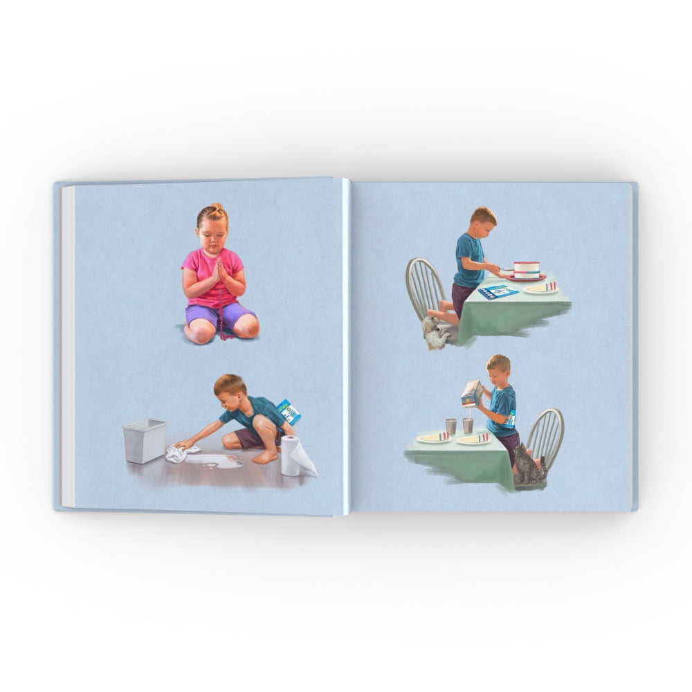 How will Lucy and Patrick manage their younger brother, plus the dog and cat, to keep family prayer time moving steadily towards dessert...which is already on the table?
