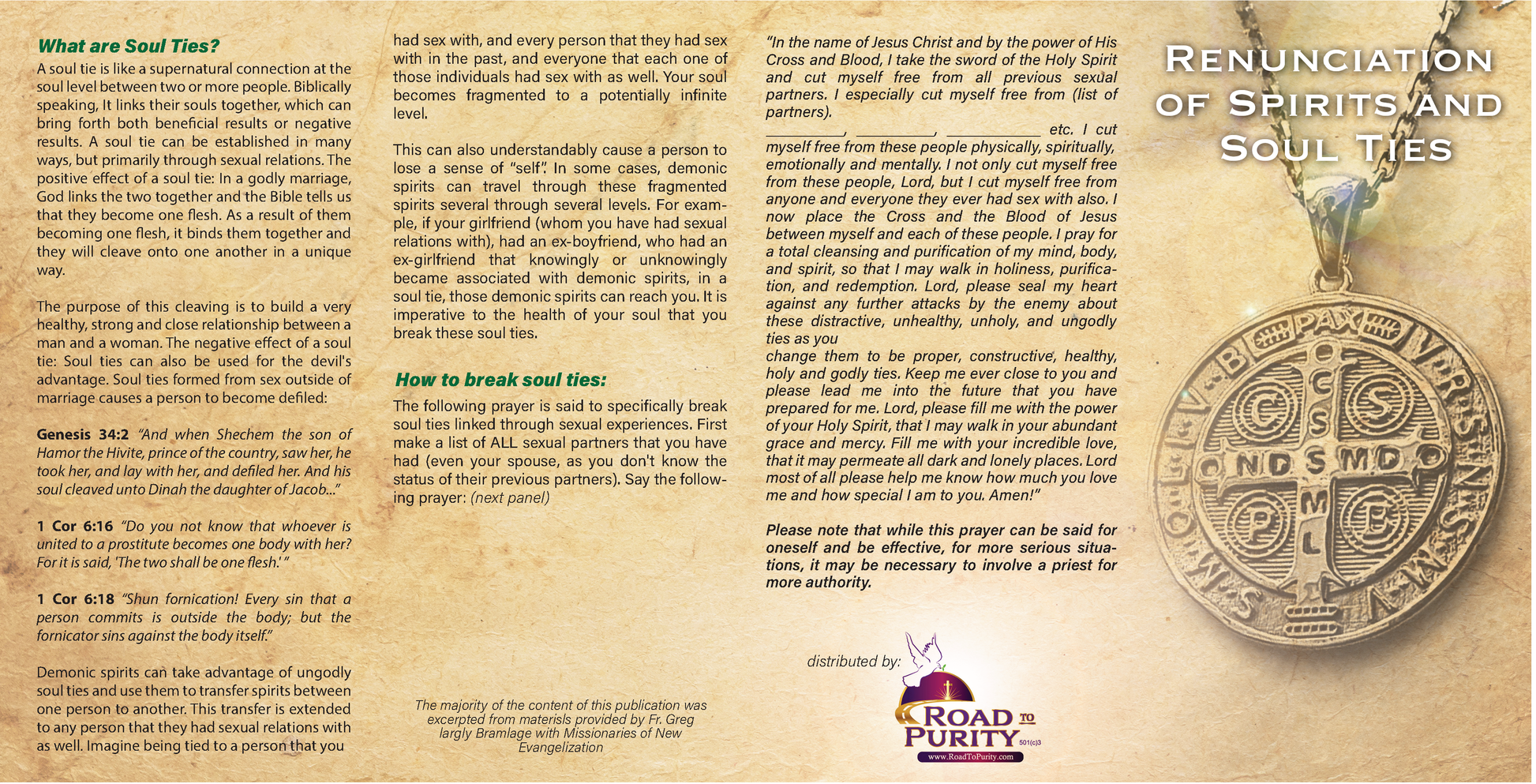 This 4-panel prayer card details the theory of renunciation of spirits, how it works and describes how to use the prayers. Includes over 100 common areas to renounce. This card also details what are soul ties and includes the prayers on how to break them. Please note that the prayers in this prayer card are powerful weapons and some find it beneficial to do with a priest.