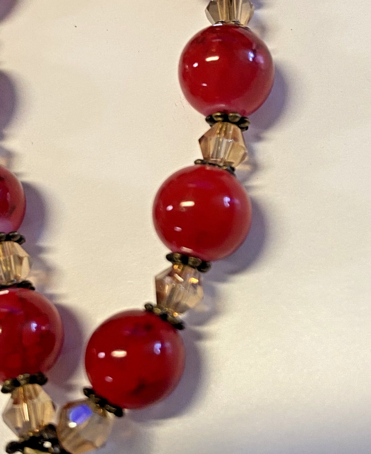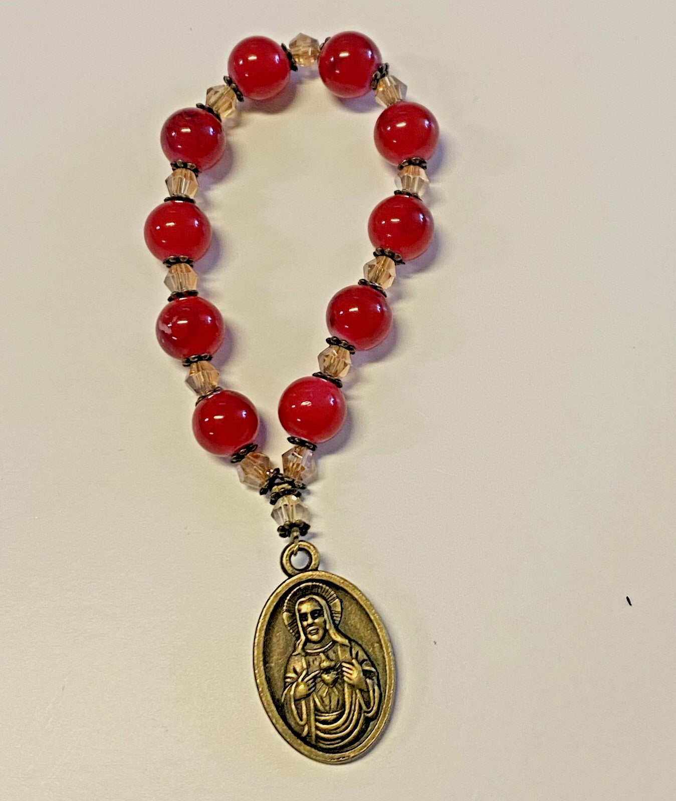 You are purchasing a very nice, red marbled 1 decade rosary that comes with a Sacred Heart & Immaculate Heart of Mary Medal.