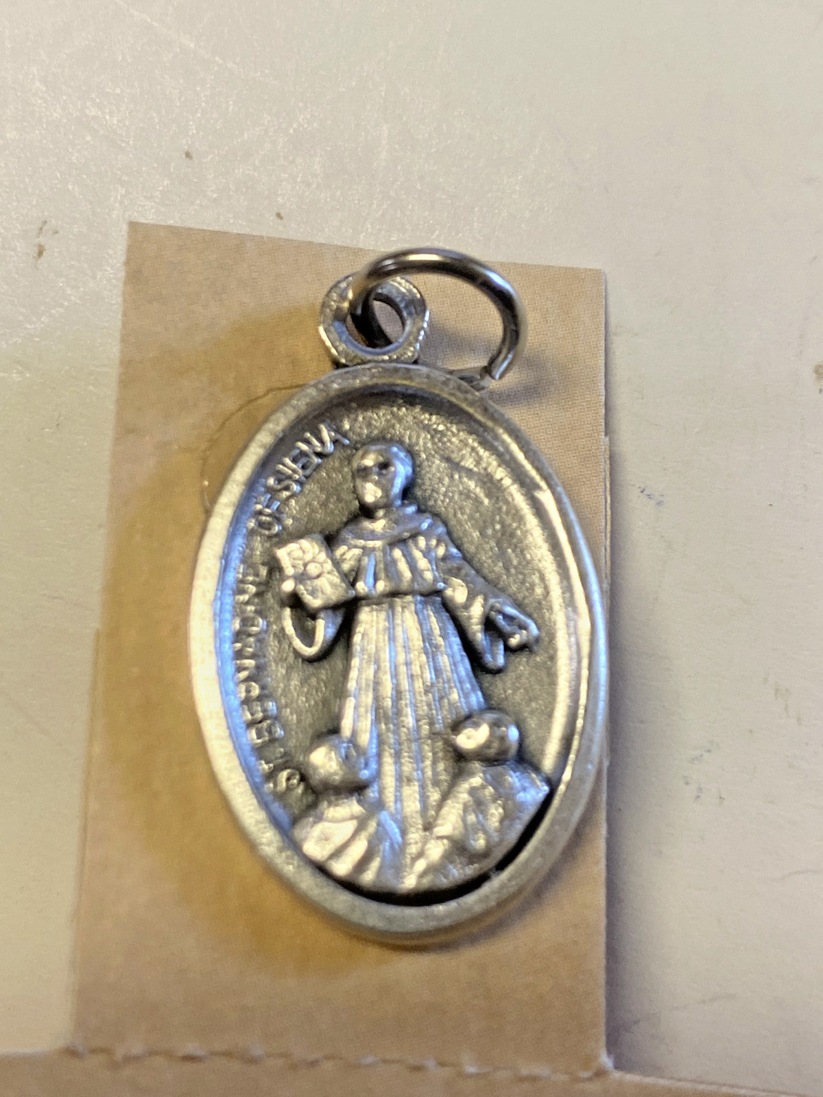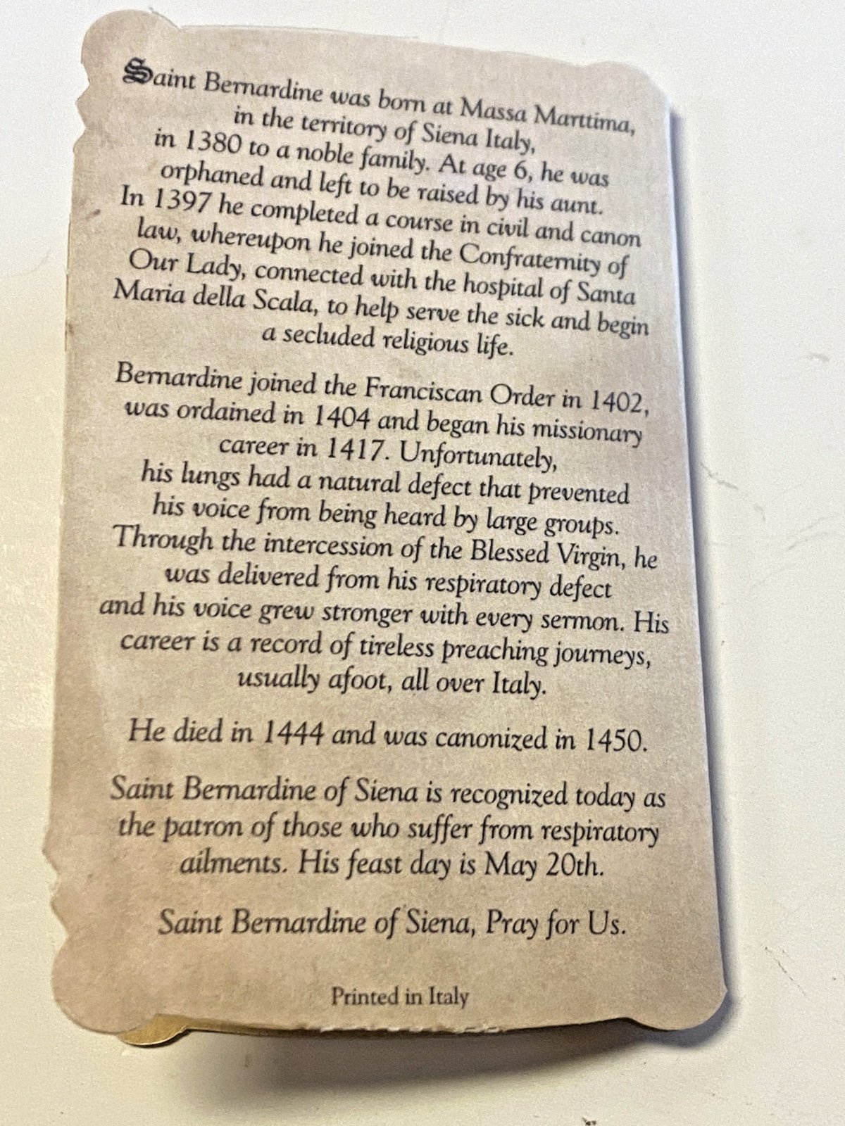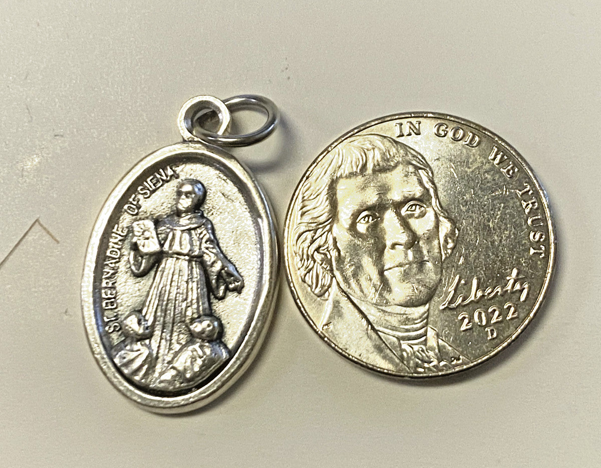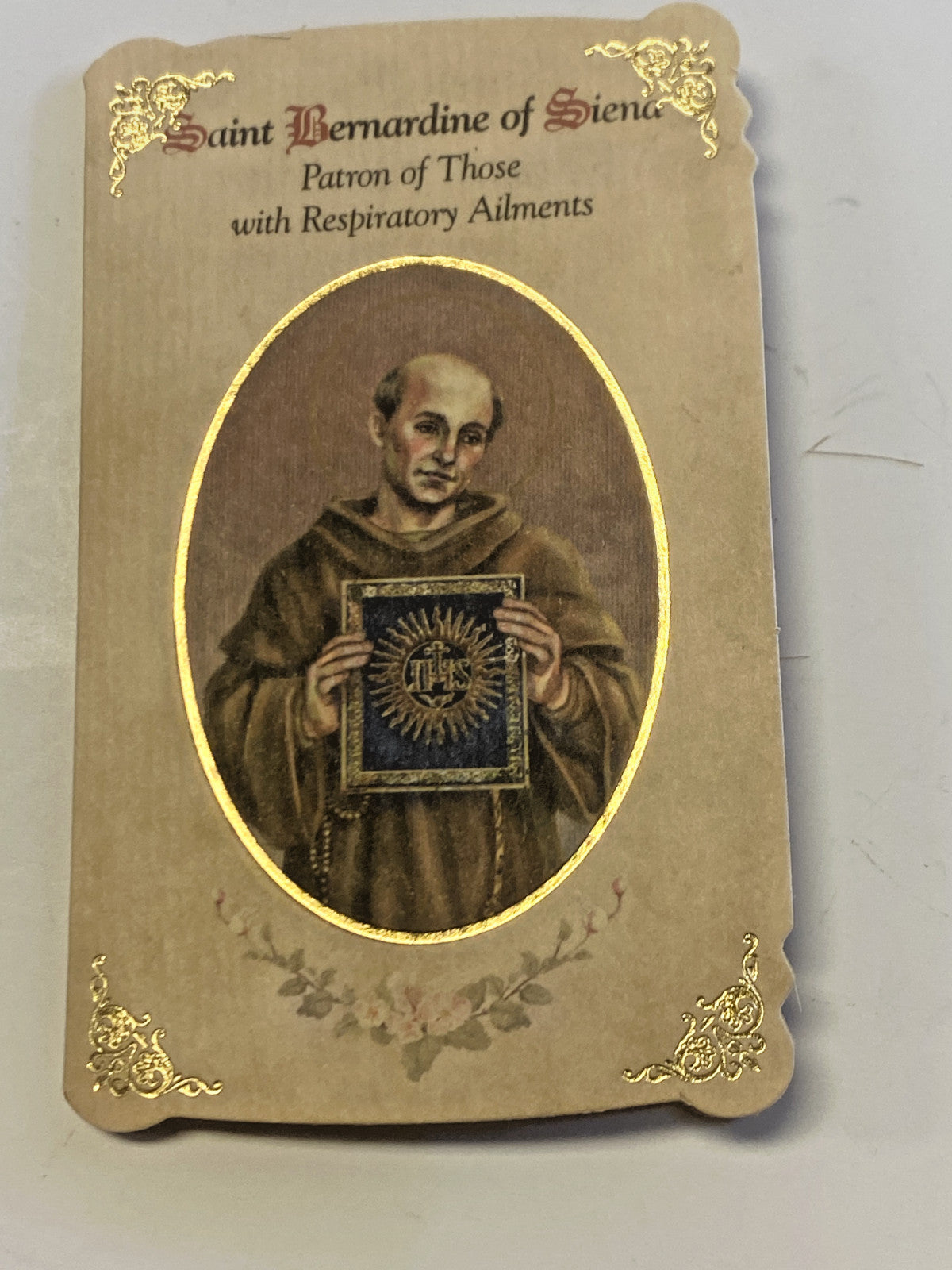You are purchasing a prayer folder of Saint Bernardine of Siena, it also comes with a silver tone medal.