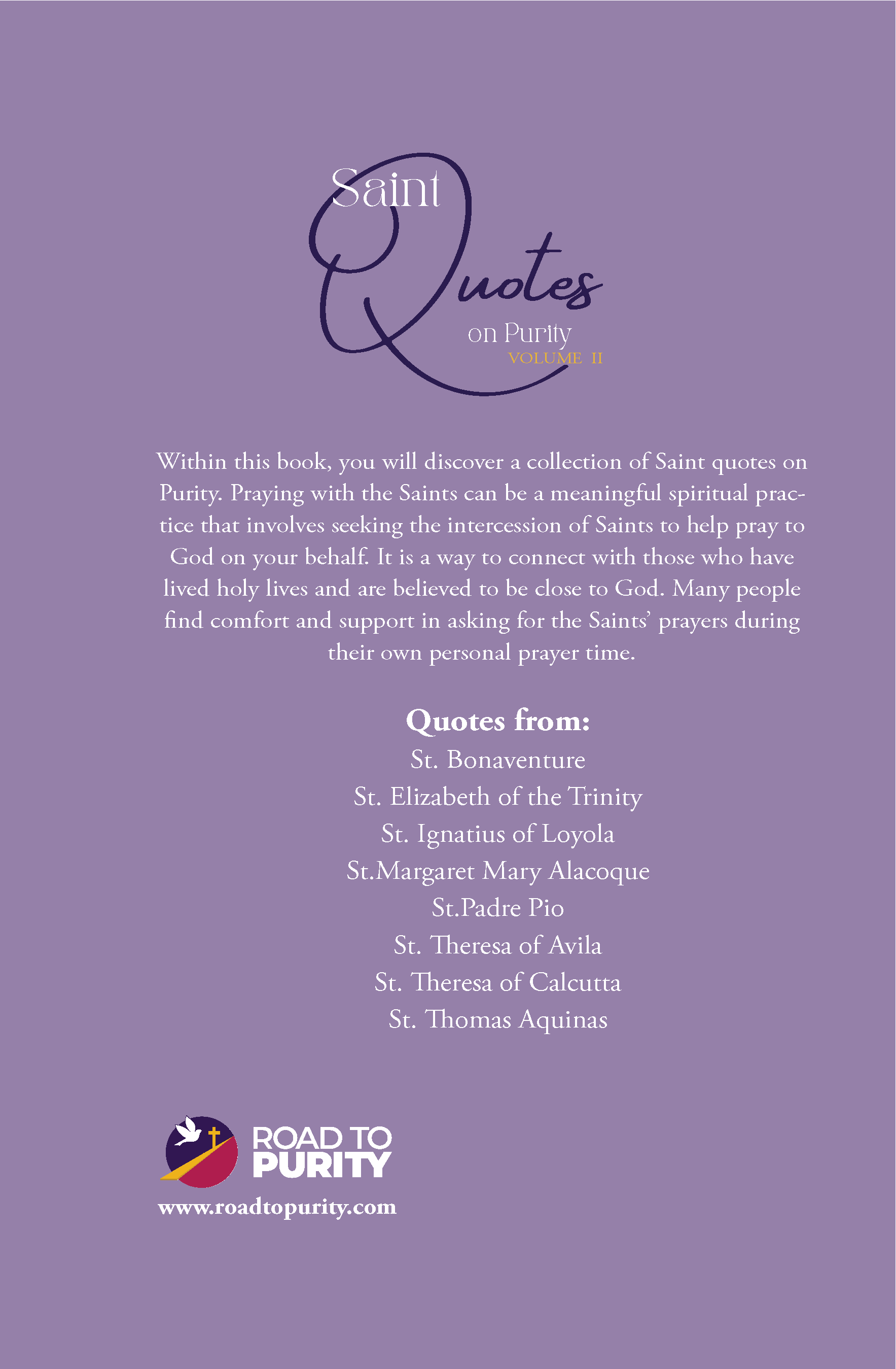 Within this book continuing from Volume 1 with different Saints, you will discover a collection of approximately 250 more Saint quotes on Purity. Praying with the Saints can be a meaningful spiritual practice that involves seeking the intercession of Saints to help pray to God on your behalf. It is a way to connect with those who have