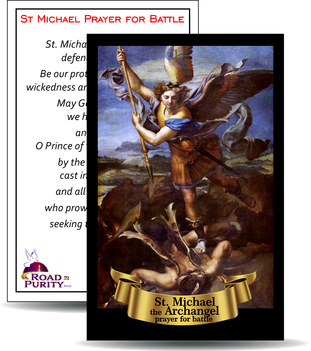 St. Michael the Archangel, defend us in battle. Be our protection against the wickedness and snares of the Devil. May God rebuke him, we humbly pray, and do thou, O Prince of the heavenly hosts, by the power of God, cast into hell Satan, and all the evil spirits, who prowl about the world seeking the ruin of souls. Amen.
