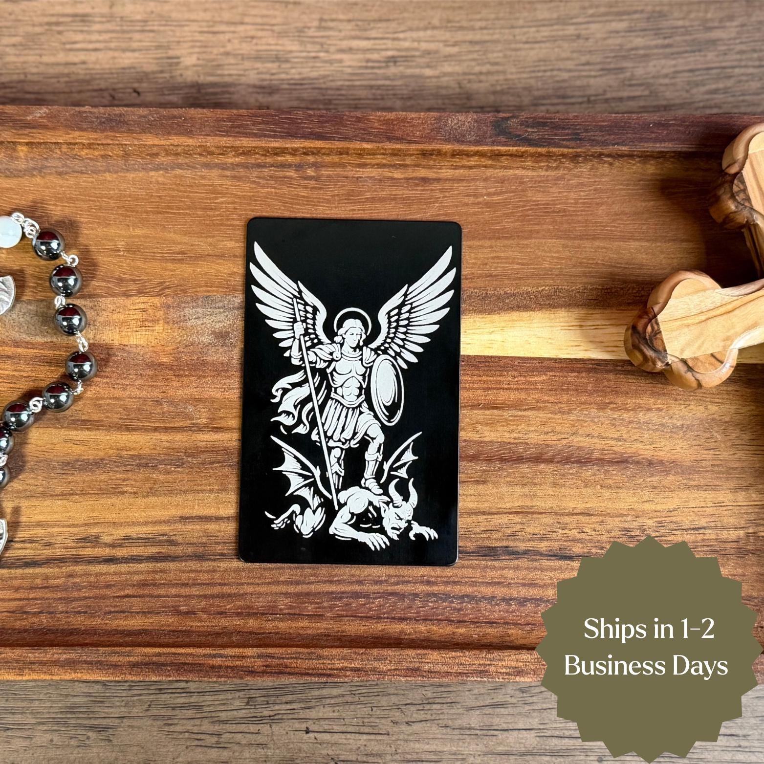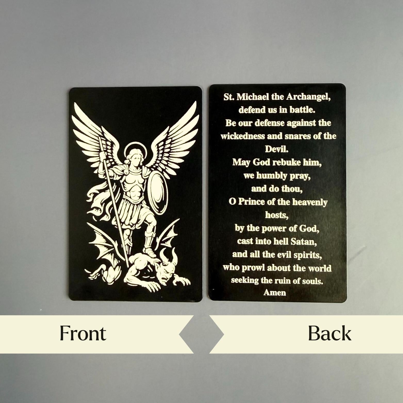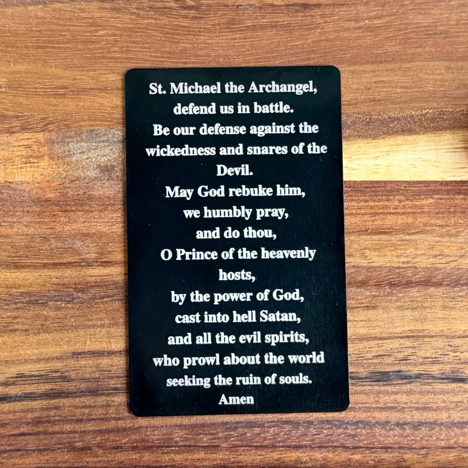 This metal prayer card offers a wallet-sized Catholic protection prayer keepsake for Police Officers and any Catholic men in the form of a pocket-sized religious item featuring Saint Michael the Archangel. A perfectly thoughtful devotional gift for Fathers, Priests, seminarians, or anyone with a devotion to Saint Michael who appreciate having a tough and durable daily carry religious item to invoke his spiritual protection.