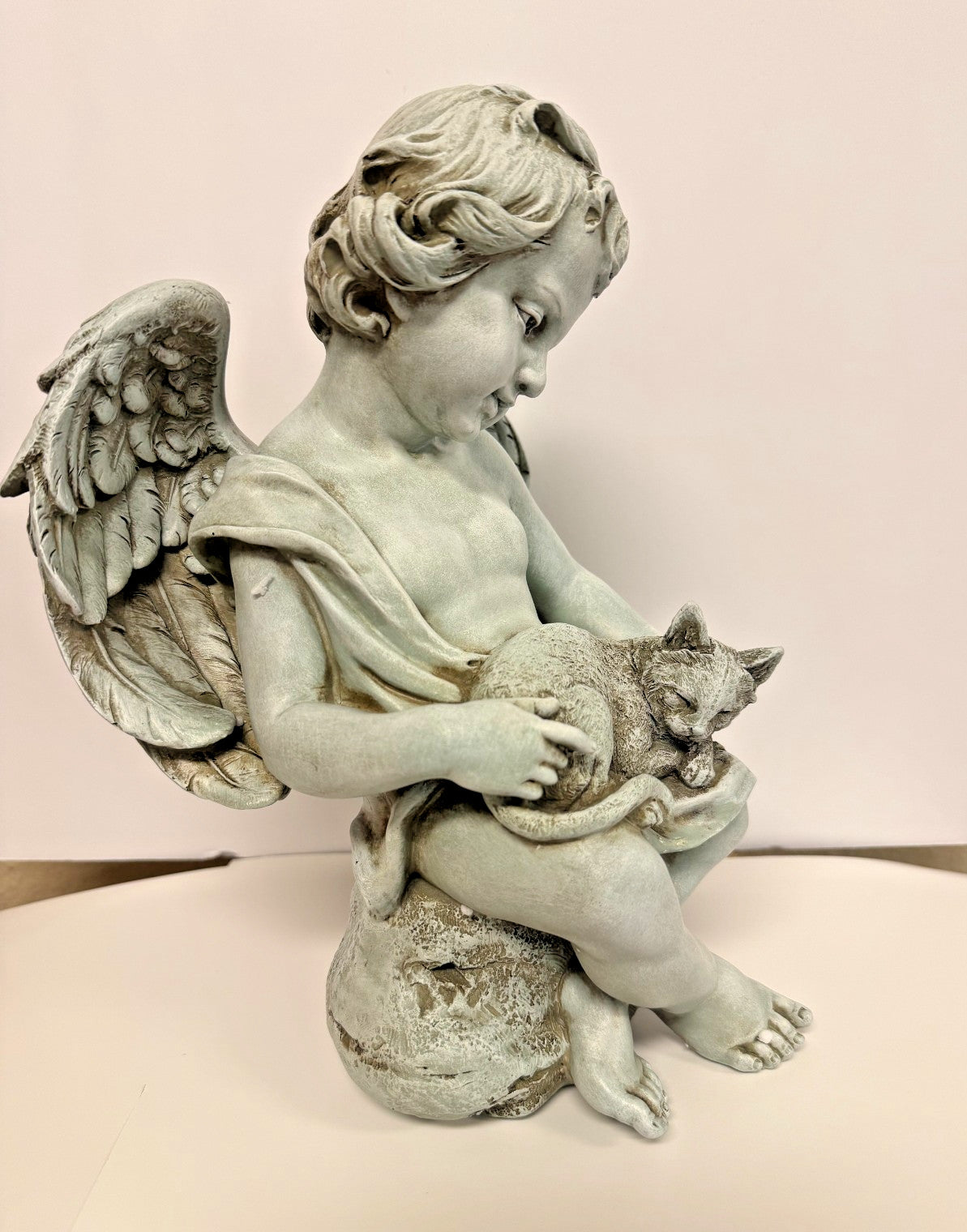 Your purchase is for a beautiful large 12" statue of angel holding a kitten.It comes with a stone finish. This statue is perfect for any garden or can be placed indoors too.
