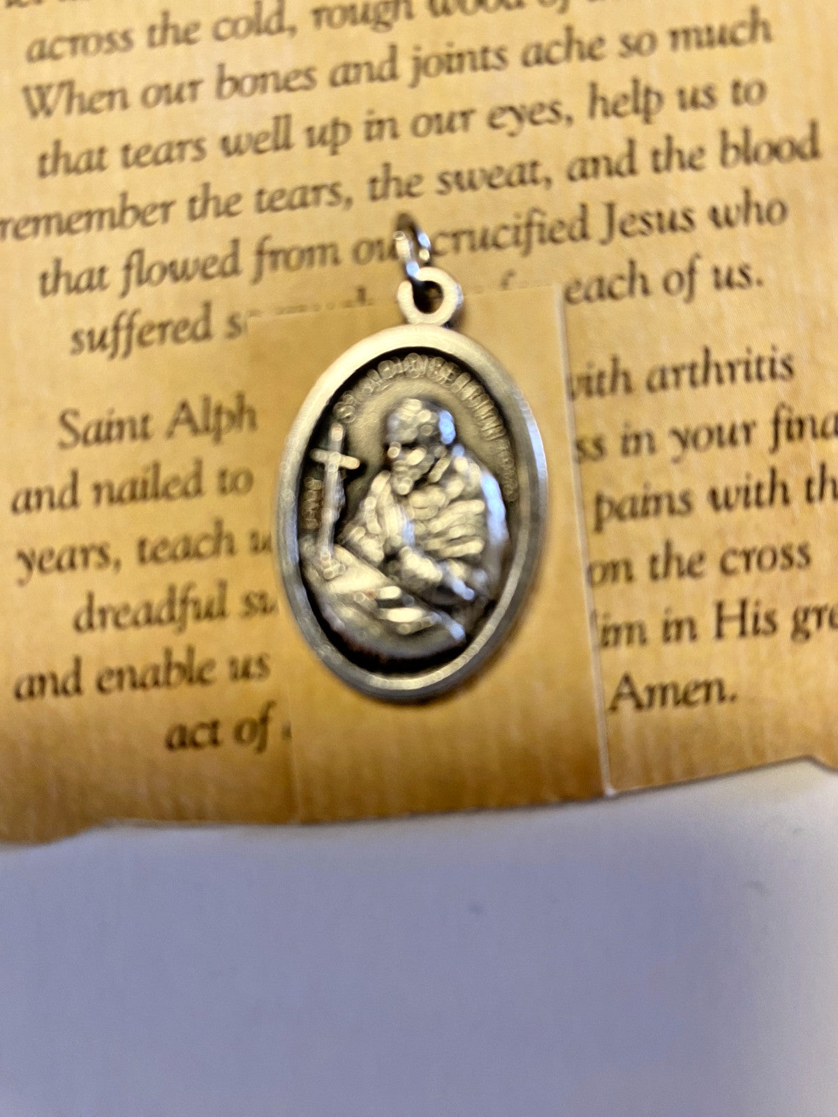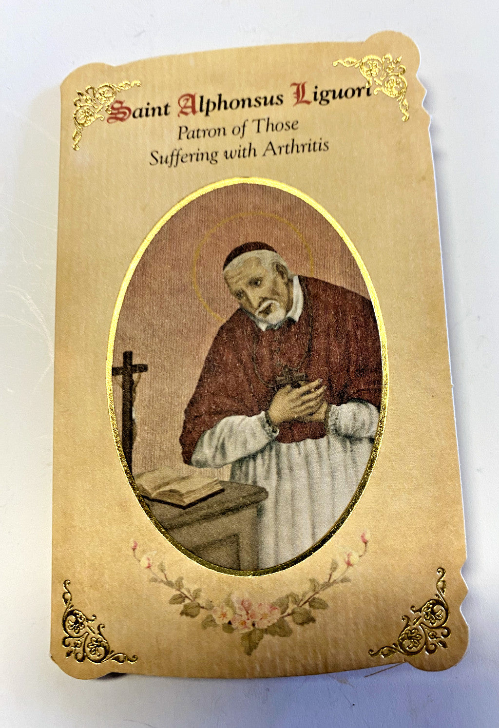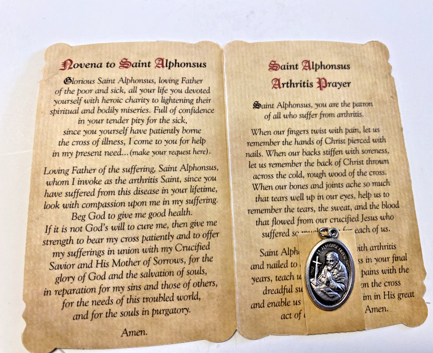 Your purchase is for a prayer card folder + silvertone medal of Saint Alphonsus Ligouri, Patron Saint of those with arthritis. It comes with 2 prayers and a brief bio.
