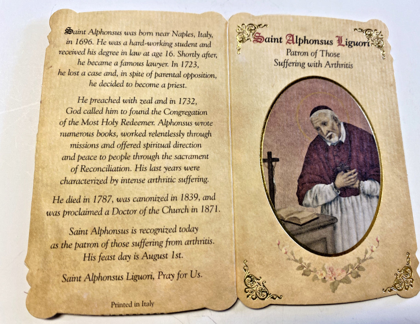Saint Alphonsus Ligouri "Arthritis Prayer" Card + Medal, New from Italy PCM-02