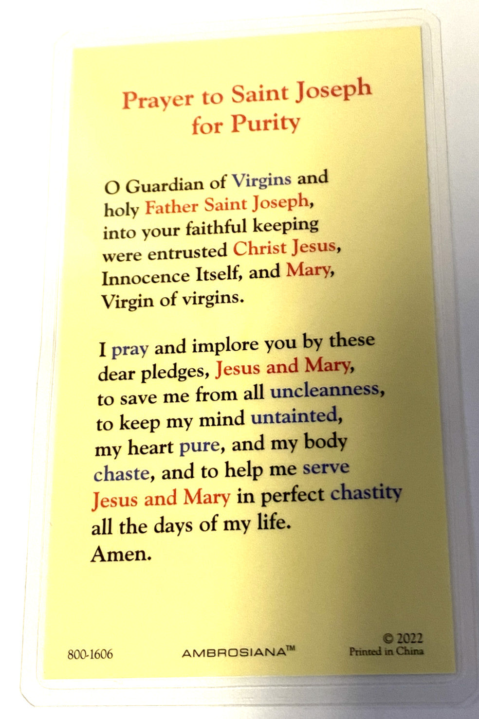 Saint Joseph Laminated "Prayer for Purity" Card, New #PCL-09