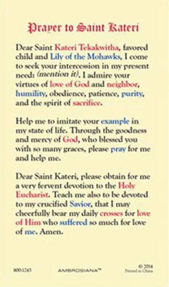 Saint Kateri Tekakwitha Laminated Prayer Card, New #PCL-46
